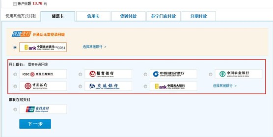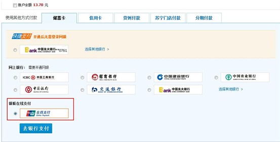 目前苏宁易购支持银联在线支付,无需开通网银,选择银联在线支付方式就可支付成功。购物时,选择银联在线支付,无需选择银行,直接点击确认支付方式按钮,订单提交成功后,点击“去银行支付”,在银联在线界面上输入相应的信息即可完成支付。