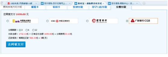 目前,苏宁易购开通的在线分期付款银行及各分期费率见下表: